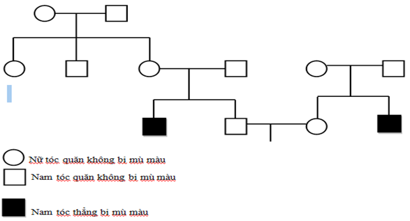 Ở người, gen quy định dạng tóc nằm trên NST thường có 2 alen, alen A qquy định tóc quăn trội hoàn toàn so với alen a quy định tóc thẳng. Bệnh mù màu đỏ - xanh lục do 2 alen b nằm trên vùng không tương đồng của nhiễm sắc thể giới tính X quy định, alen trội B quy định mắt nhìn màu bình thường. Cho sơ đồ phả hệ sau: