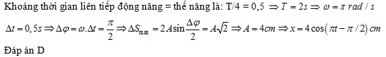 Một vật dao động điều hoà dọc theo trục Ox nằm ngang, gốc O và mốc thế năng ở vị trí cân bằng. Cứ sau thì động năng lại bằng thế năng và trong thời gian1/2s vật đi được đoạn đường dài nhất bằng 4√2 cm Chọn t=0 lúc vật qua vị trí cân bằng theo chiều dương. Phương trình dao động của vật là