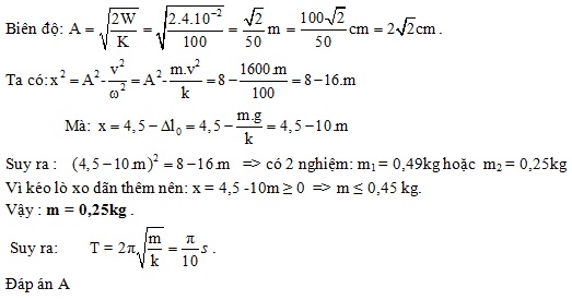 Con lắc lò xo treo thẳng đứng có vật nhỏ m, lò xo có độ cứng k=100N/m. Vật đang treo ở vị trí cân bằng thì được kéo tới vị trí lò xo dãn 4,5cm rồi truyền cho vật vận tốc 40cm/s theo phương thẳng đứng; lúc này vật dao động điều hòa với cơ năng W=40mJ. Lấy g=10m/s2. Chu kì dao động là