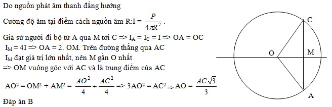 Tại O có một nguồn phát âm thanh đẳng hướng với công suất không đổi. Một người đi bộ từ A đến C theo đường thẳng và lắng nghe âm thanh từ nguồn O thì nghe thấy cường độ âm tăng từ I đến 4I rồi lại giảm xuống I. Khoảng cách AO bằng