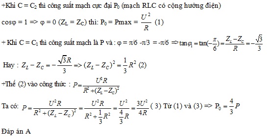 Đoạn mạch gồm một cuộn dây có điện trở R và độ tự cảm L nối tiếp với một tụ điện biến đổi có điện dung C thay đổi được. Hiệu điện thế xoay chiếu ở hai đầu mạch là u = U√2cos(ωt + π/6)(V). Khi C = C1 thì công suất mạch là P và cường độ dòng điện qua mạch là: i = I√2cos(ωt + π/3) (A). Khi C = C2 thì công suất mạch cực đại P0. Tính công suất cực đại P0 theo P.
