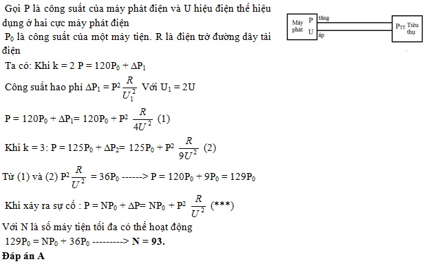Tại một điểm M có một máy phát điện xoay chiều một pha có công suất phát điện và điện áp hiệu dụng ở hai cực của máy phát đều không đổi. Nối hai cực của máy phát với một trạm tăng áp có hệ số tăng áp là k đặt tại đó. Từ máy tăng áp điện năng được đưa lên dây tải cung cấp cho một xưởng cơ khí cách xa điểm M. Xưởng cơ khí có các máy tiện cùng loại công suất khi hoạt động là như nhau. Khi hệ số k = 2 thì ở xưởng cơ khí có tối đa 120 máy tiện cùng hoạt động. Khi hệ số k = 3 thì ở xưởng cơ khí có tối đa 125 máy tiện cùng hoạt động. Do xảy ra sự cố ở trạm tăng áp, người ta phải nối trực tiếp dây tải điện vào hai cực của máy phát điện. Coi rằng chỉ có hao phí trên dây tải điện là đáng kể. Điện áp và dòng điện trên dây tải điện luôn cùng pha .