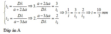 Trong thí nghiệm về giao thoa ánh sáng bước sóng ánh sáng bằng λ, khoảng cách từ hai khe đến màn là D. Biết khi khoảng cách giữa hai khe là a+2Δa thì khoảng vân bằng 3mm, khi khoảng cách giữa hai khe là a-3Δa thì khoảng vân là 4mm. Khi khoảng cách giữa hai khe là a thì khoảng vân bằng