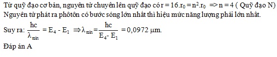 eV (n = 1, 2, 3, …). Từ trạng thái cơ bản, nguyên tử hiđrô hấp thụ phôtôn thích hợp nên bán kính quỹ đạo dừng tăng 16 lần. Khi đó bước sóng nhỏ nhất của bức xạ do nguyên tử hiđrô phát ra là