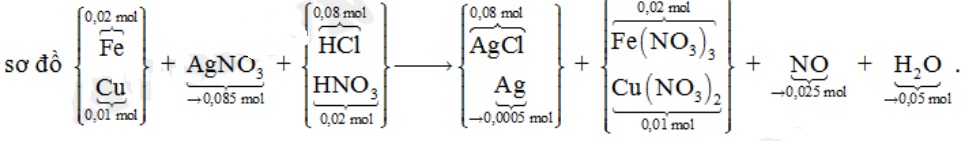Hòa tan hoàn toàn 0,02 mol Fe và 0,01 mol Cu vào 200 ml dung dịch gồm HNO3 0,1M và HCl 0,4M thu được dung dịch X. Cho dung dịch AgNO3 dư vào X thì xuất hiện a gam kết tủa. Biết các phản ứng đều xảy ra hoàn toàn, sản phẩm khử của NO là khí NO duy nhất. Giá trị của a là