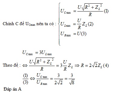 Cho mạch điện xoay chiều như hình vẽ. Điện dung C có giá trị thay đổi được và cuộn dây thuần cảm. Điều chỉnh giá trị của C và ghi lại số chỉ lớn nhất trên từng vôn kế thì thấy UCmax = 3ULmax. Khi đó UCmax gấp bao nhiêu lần URmax?