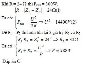 Hai đầu đoạn mạch RLC, cuộn dây thuần cảm, được duy trì điện áp uAB=U0 cosωt (V). Thay đổi R, khi điện trở có giá trị R=24(Ω) thì công suất đạt giá trị cực đại 300W. Hỏi khi điện trở bằng 18(Ω) thì mạch tiêu thụ công suất bằng bao nhiêu