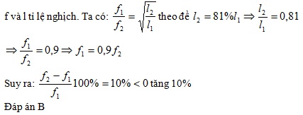 Một con lắc đơn có chiều dài dây treo l, dao động điều hòa tại nơi có gia tốc g. Khi giảm chiều dài con lắc đi 19% thì tần số con lắc sẽ