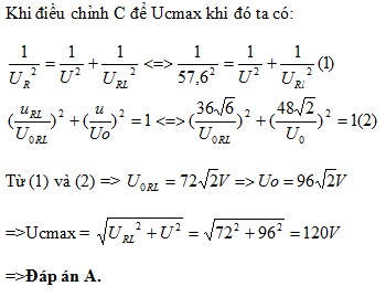cos (ωt)(V) vào hai đầu đoạn mạch nối tiếp theo thứ tự R,L,C ( trong đó C thay đổi được ). Điều chỉnh C đến khi điện áp hiệu dụng giữa hai đầu của nó đạt cực đại UCmax thì khi đó điện áp hiệu dụng giữa hai đầu R bằng 57,6V .Mặt khác,vào thời điểm điện áp tức thời uRL=36