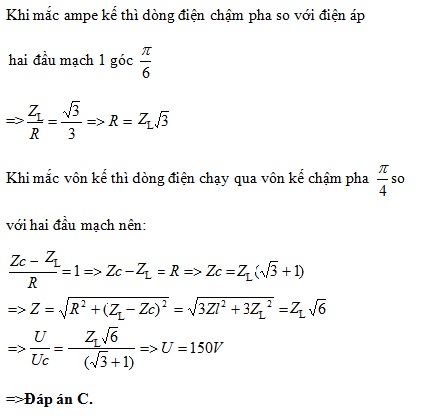 Đặt một nguồn điện xoay chiều có hiệu điện thế hiệu dụng U và tần số f vào hai đầu đoạn mạch RLC nối tiếp, trong đó cuộn dây thuần cảm. Nối hai đầu tụ điện với một ampe kế lý tưởng thì thấy ampe kế chỉ 1A và dòng điện tức thời chạy qua ampe kế chậm pha góc π/6 so với hiệu điện thế tức thời hai đầu đoạn mạch .Nếu thay ampe kế bằng một vôn kế lý tưởng thì thấy nó chỉ 167,3V, đồng thời hiệu điện thế giữa hai đầu vôn kế chậm pha góc π/4 so với hiệu điện thế tức thời hai đầu đoạn mạch .Hiệu điện thế hiệu dụng của nguồn xoay chiều là: