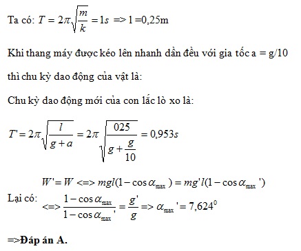 Trong thang máy đứng yên có treo một con lắc lò xo và một con lắc đơn.Con lắc lò xo gồm vật m khối lượng 250g và lò xo có độ cứng k=10N/m. Chu kỳ dao động của hai con lắc bằng nhau và biên độ góc cảu con lắc đơn là 80. Khi thang máy được kéo lên nhanh dần đều với gia tốc có trị số là a=g/10 thì chu kỳ T và biên độ a cảu con lắc đơn là bao nhiêu? Lấy π2=g=10m/s2
