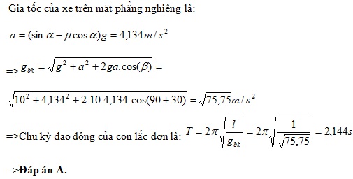 Một con lắc đơn l=1m treo vào trần một toa xe chuyển động xuống dốc nghiên góc α =300 so với mặt phẳng nằm ngang. Hệ số ma sát giữa xe với mặt phẳng nằm nghiêng là µ=0,1 .Lấy π2=g=10m/s2 . Con lắc đơn dao động với chu kỳ xấp xỉ bằng: