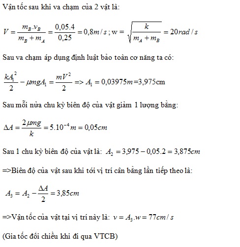 Con lắc lò xo nằm ngang gồm lò xo có độ cứng k=100N/m và quả cầu A khối lượng 200g đang đứng yên ở vị trí cân bằng thì bị quả cầu B khối lượng 50g bắn vào dọc theo trục lò xo với tốc độ 4m/s. Va chạm giữa hai quả cầu là va chạm mềm.Hệ số ma sát giữa các quả cầu với mặt phẳng đỡ là µ=0,01. Lấy g=10m/s2 . Vận tốc cảu hai vật lúc gia tốc đổi chiều lần thứ 3 kể từ lúc va chạm (t=0) là: