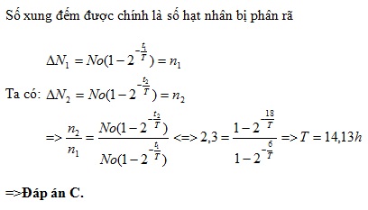 Để đo chu kỳ bán rã của một chất phóng xạ người ta cho máy đếm xung bắt đầu đếm từ t0=0 .Đến thời điểm t1=6h, máy đếm được n1 xung. Đến thời điểm t2=3t1 , máy đếm được n2=2,3n1 xung ( Một hạt bị phân rã thì số đếm của máy tăng lên một đơn vị ). Chu kỳ bán rã của chất phóng xạ này xấp xỉ bằng :