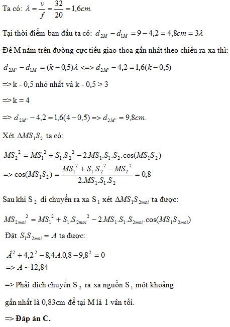 Hai nguồn phát sóng kết hợp S1 , S2 trên mặt nuwocs đặt cách nhau 12cm phát ra hai dao động điều hoà cùng tần số f=20Hz , cùng biên độ và cùng pha ban đầu. Xét điểm M trên mặt nước cách S1 ,S2 những khoảng cách tương ứng d1=4,2cm ; d2=9cm. Biết vận tốc truyền sóng trên mặt nước v=32cm/s. Giữ nguyên tần số f và các vị trí S1, M . Hỏi muốn điểm M nằm trên vân lõm thì phải dịch chuyển nguồn S2 dọc theo đừng nối S1 ,S2 từ vị trí ban đầu ra phía xa nguồn S1 một khoảng nhỏ nhất là bao nhiêu?
