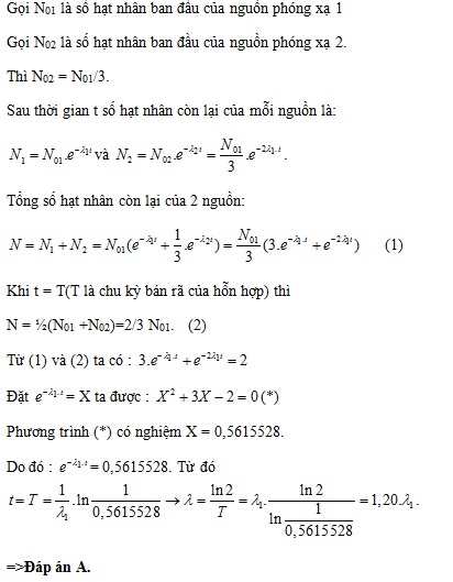 Người ta trộn hai nguồn phóng xạ có hằng số phóng xạ tương ứng là λ1 và λ2 (λ2 =2λ1 ) với