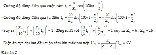 Đặt nguồn điện xoay chiều u1 = 10cos(100πt)V vào hai đầu cuộn cảm thuần L thì cường độ dòng điện tức thời chạy qua cuộn cảm là i1. Đặt nguồn điện xoay chiều u2 = 20sin(100πt)V vào hai đầu tụ điện C thì cường độ dòng điện tức thời chạy qua tụ điện là i1. Mối quan hệ về giá trị tức thời giữa cường độ dòng điện qua hai mạch trên là 9i12 +16i22 = 25(mA)2. Khi mắc cuộn cảm nối tiếp với tụ điện rồi mắc vào nguồn điện xoay chiều u1 thì điện áp cực đại trên cuộn cảm thuần là