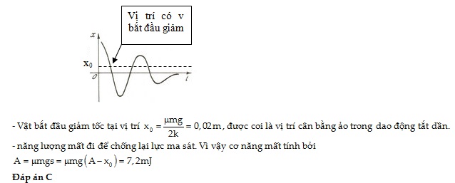 Một con lắc lò xo đặt trên mặt phẳng nắm ngang gồm lò xo nhẹ có độ cứng 2 N/m và vật nhỏ khối lượng 40 g. Hệ số ma sát trượt giữa vật và mặt phẳng ngang là 0,1. Ban đầu giữ vật ở vị trí lò xo bị giãn 20 cm rồi buông nhẹ để con lắc dao động tắt dần. Lấy g = 10 m/s2. Kể từ lúc đầu cho đến thời điểm tốc độ của vật bắt đầu giảm, cơ năng của con lắc lò xo đã giảm một lượng bằng