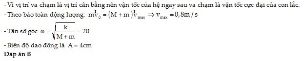 Một con lắc lò xo có độ cứng 40 N/m và khối lượng vật M là 75 g đang nằm yên trên mặt phẳng ngang, nhắn. Một vật nhỏ m có khối lượng 25 g chuyển động theo phương trùng với trục lò xo với tốc độ 3,2 m/s đến va chạm và dính chặt vào M. Sau va chạm, hai vật dao động điều hòa với biên độ bằng