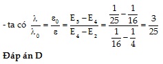 (eV) (với n = 1, 2, 3,…). Khi nguyển tử chuyển từ quỹ đạo dừng n = 5 về quỹ đạo dừng n = 4 thì nguyên tử phát ra phôtôn có bước sóng λ0. Khi nguyên tử hấp thụ một photon có bước sóng λ thì chuyển từ trạng thái dừng có mức năng lượng tưng ứng với n = 2 lên trạng thái dừng có mực năng lượng tương ứng với n = 4. Tỉ số