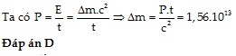 Công suất phát xạ của Mặt Trời là 3,9.1026 W. Cho c = 3.108 m/s. Trong một giờ khối lượng Mặt Trời giảm mất