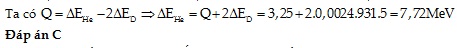 Biết phản ứng nhiệt hạch 12D+12 D → 32 He + n tỏa ra một năng lượng bằng Q = 3,25MeV. Độ