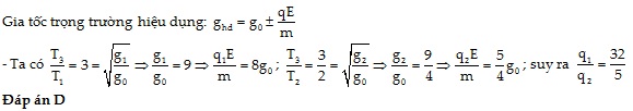 Có ba con lắc cùng chiều dài dây treo, cùng khối lượng. Con lắc thứ nhất và thứ hai mang điện tích q1 và q2, con lắc thứ ba không mang điện tích. Chu kì dao động điều hoà của chúng trong điện trường có phương thẳng đứng lần lượt là T1, T2 và T3 với T3 = 3T1; 3T2 = 2T3. Tính q1 và q2. Biết q1 + q2 = 7,4.10-8 C.
