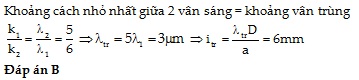 Trong thí nghiệm I-âng về giao thoa ánh sáng, khoảng cách giữa hai khe là a = 1mm, từ hai khe đến màn hứng là D = 2m, nguồn sáng gồm hai bức xạ đơn sắc λ1 = 0,6 µm và λ2 = 0,5 µm, nếu hai vân sáng của hai bức xạ trùng nhau ta chỉ tính là một vân sáng. Khoảng cách nhỏ nhất giữa hai vân sáng quan sát được trên màn là: