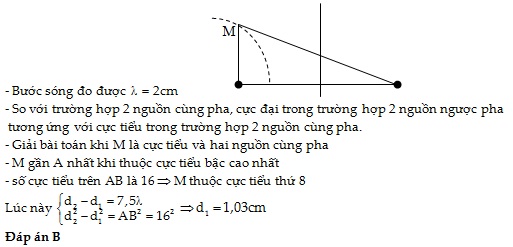 Tại mặt chất lỏng có hai nguồn phát sóng kết hợp A, B cách nhau 16cm, dao động điều hòa theo phương vuông góc với mặt chất lỏng với phương trình uA = 2cos40πt cm và uB = 2cos(40πt + π) cm. Tốc độ truyền sóng trên mặt chất lỏng là 40cm/s. Gọi M là một điểm thuộc mặt chất lỏng, nằm trên đường thẳng Ax vuông góc với AB, cách A một đoạn ngắn nhất mà phần tử chất lỏng tại M dao động với biên độ cực đại. Khoảng cách AM ngắn nhất bằng