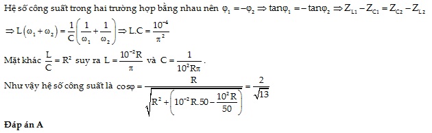 Cho mạch điện xoay chiều RLC nối tiếp, cuộn dây thuần cảm. Biết L = CR2. Đặt vào hai đầu đoạn mạch một điện áp xoay chiều ổn định, mạch có cùng hệ số công suất với hai giá trị của tần số góc 50π rad/s đến 200π rad/s. Hệ số công suất của đoạn mạch bằng