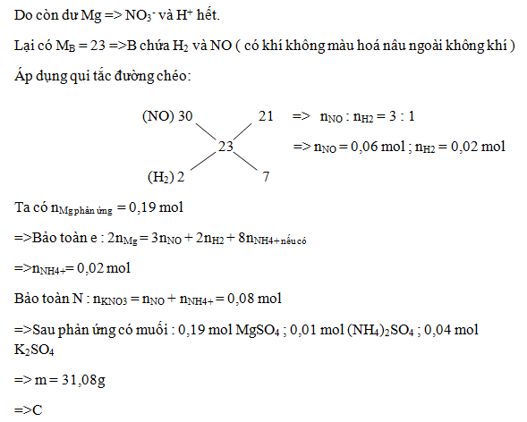 Cho 5 gam bột Mg vào dung dịch hỗn hợp KNO3 và H2SO4, đun nhẹ khi phản ứng xảy ra hoàn toàn thu được dung dịch A chứa m gam muối; 1,792 lít hỗn hợp khí B ( đktc) gồm hai khí không màu, trong đó có một khí hóa nâu ngoài không khí và còn lại 0,44 gam chất rắn không tan. Biết tỉ khối hơi của B đối với H2 là 11,5. Giá trị của m là