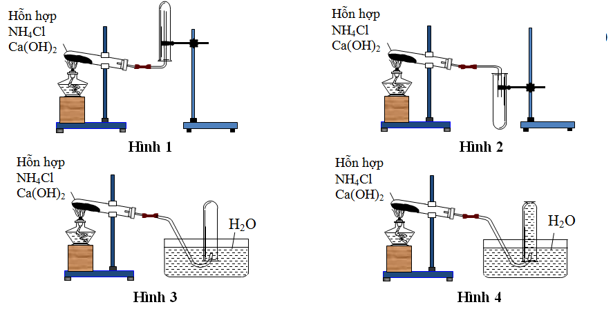 Trong phòng thí nghiệm, khí amoniac được điều chế bằng cách cho muối amoni tác dụng với kiềm (ví dụ Ca(OH)2) và đun nóng nhẹ. Hình vẽ nào sau đây biểu diễn phương pháp thu khí NH3 tốt nhất?