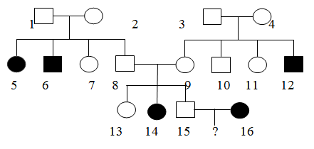 Biết rằng không phát sinh đột biến mới ở tất cả các cá thể trong phả hệ, xác suất để cặp vợ chồng 15 và 16 sinh con trai đầu lòng và con gái thứ 2 đều không bị bệnh là