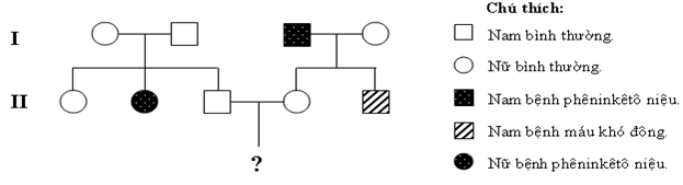 Ở người, bệnh phêninkêtô niệu do một trong hai alen của gen nằm trên nhiễm sắc thể thường; bệnh máu khó đông do một trong hai alen của gen nằm trên đoạn không tương đồng của nhiễm sắc thể X qui định. Theo dõi sự di truyền của hai bệnh này trong một gia đình qua hai thế hệ được thể hiện qua sơ đồ phả hệ dưới đây: