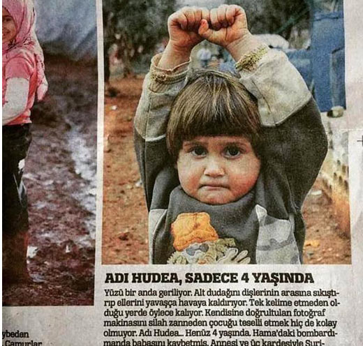 Bức ảnh dưới đây có tên là Em bé đầu hàng được phóng viên Thổ Nhĩ Kỳ Osman Sagirli chụp tại trại tị nạn Atmen gần biên giới Thổ Nhì Kỳ - Syria. Em bé trong bức ảnh tên là Hudea, bốn tuổi, em cùng mẹ và ba anh chị em khác đi sơ tán, bố Hudea đã mất trong một trận đánh bom tại thành phố Hama, Syria. Chia sẻ về bức ảnh này, Sagirli nói: “Cô bénhăn mặt khi nhìn thấy tôi, bé cắn môi, sau đó chầm chậm giơ hai tay lên, bé đứng đó mà không nói một lời, thực sự rất khó để có thể thuyết phục cô bé rằng cái tôi đang cầm chỉ là máy ảnh chứ không phải một khẩu súng".