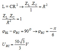 Cho đoạn mạch xoay chiều LRC nối tiếp, có biểu thức của hiệu điện thế ở hai đầu đoạn mạch LR là u1 = 50cos(100 πt + π/3) (V), L = CR2 và uLR sớm pha so với uAB là π/3 rad. Biên độ và pha ban đầu của uRC là