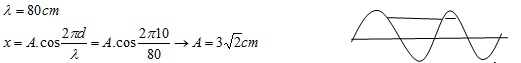 Một sóng chạy lan truyền theo một phương với biên độ sóng không thay đổi. Tại một thời điểm bất kỳ, các điểm có li độ 3 cm cách nhau những khoảng lần lượt là 20 cm, 60 cm, 20 cm, 60 cm, 20 cm. Biên độ của sóng trong môi trường