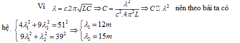 Một mạch dao động lí tưởng được dùng làm mạch chọn sóng của một máy thu vô tuyến điện. Điện dung của nó có giá trị thay đổi được, cuộn cảm có độ tự cảm không đổi. Nếu điều chỉnh điện dung C = 4C1+9C2 thì máy thu bắt được sóng điện có bước sóng 51m. Nếu điều chỉnh điện dung C = 9C1+C2 thì máy thu bắt được sóng điện từ có bước sóng 39m. Nếu điều chỉnh điện dung của tụ lần lượt là C = C1 và C = C2 thì máy thu bắt được sóng điện từ có bước sóng theo thứ tự đó là: