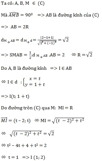 Trong mặt phẳng xOy cho điểm M(2; 1) và đường thẳng d: x – y + 1 = 0. Viết phương trình đường tròn (C) đi qua M cắt d tại 2 điểm phân biệt sao cho ∆MAB vuông tại M và có diện tích bằng 2.
