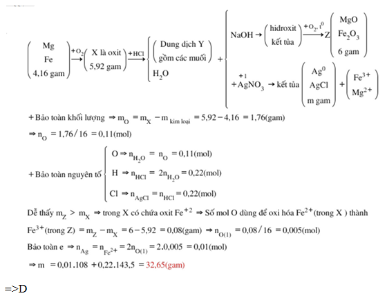 Đốt cháy 4,16 gam hỗn hợp Fe ;Mg trong oxi thu được 5,92 gam hỗn hợp chỉ gồm toàn các oxit. Hòa tan hoàn toàn X trong HCl thu được dung dịch Y. Cho NaOH dư vào Y thu được kết tủa Z, Nung Z trong không khí đến khối lượng không đổi thu được 6 gam chất rắn. Mặt khác, Cho Y tác dụng với AgNO3 dư thu được m gam kết tủa. Giá trị của m là: