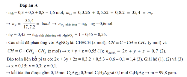 Một bình kín chỉ chứa các chất: axetilen (0,3mol), vinyl axetilen (0,5mol) và hidro (0,8mol) và một ít bột Niken. Nung nóng bình một thời gian, thu được hỗn hợp khí X có tỉ khối so với H2 là 17,7. Khí X phản ứng vừa đủ với 0,7mol AgNO3 trong dung dịch NH3 thu được m gam kết tủa và 10,08 lit hỗn hợp khí Y (đktc). Khí Y phản ứng tối đa với 0,1mol Br2 trong dung dịch. Giá trị của m là: