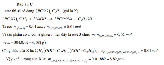 Khi thuỷ phân a gam một este X thu được 0,92 gam glixerol, 3,02 gam natri linoleat (C17H31COONa) và m gam muối của natri oleat (C17H33COONa). Giá trị của a và m là