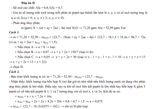 Hỗn hợp X gồm 3 peptit đều mạch hở có tỉ lệ mol tương ứng là 1 : 1 : 2. Thủy phân hoàn toàn m gam X, thu được hỗn hợp sản phẩm gồm 71,20 gam alanin và 52,50 gam glyxin. Biết tổng số liên kết peptit trong phân tử của ba peptit trong X nhỏ hơn 10. Giá trị của m là: