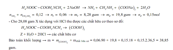Hỗn hợp X gồm các chất Y (C3H10N2O4) và chất Z (C4H8N2O3); trong đó Y là muối của axit đa chức, Z là đipeptit mạch hở. Cho 28,08 gam X tác dụng với dung dịch NaOH dư, đun nóng, thu được 0,12mol hỗn hợp khí đều làm xanh quỳ tím ẩm. Mặt khác 28,08 gam X tác dụng với dung dịch HCl dư thu được m gam chất hữu cơ. Giá trị của m là: