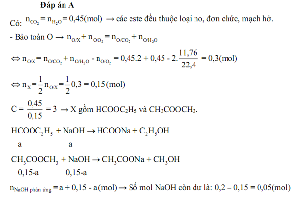 Hỗn hợp X gồm 2 este đồng phân. Đốt cháy hoàn toàn m gam X cần dùng 11,76 lit O2 (đktc) thu được 19,8 gam CO2 và 8,1 gam H2O. Cho m gam X tác dụng hết với 200ml dung dịch NaOH 1M, cô cạn dung dịch sau phản ứng thu được 13,6 gam chất rắn và hỗn hợp ancol Y. Để đốt cháy hoàn toàn Y cần dùng vừa đủ V lit O2 (đktc). Giá trị của V là: