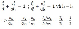 Hai mạch dao động điện từ lí tưởng đang có dao động điện từ tự do với cùng cường độ dòng điện cực đại I0. Chu kỳ dao động riêng của mạch thứ nhất là T1, của mạch thứ hai là T2 = 2T1. Khi cường độ dòng điện trong hai mạch có cùng độ lớn và nhỏ hơn I0 thì độ lớn điện tích trên một bản tụ điện của mạch dao động thứ nhất là q1 và của mạch dao động thứ hai là q2. Tỉ số