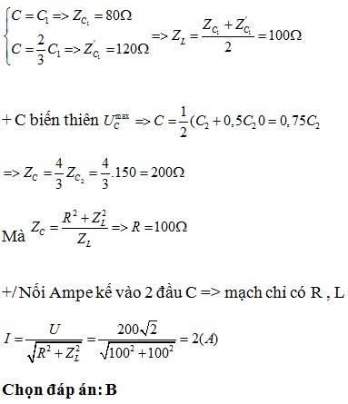 hoặc C=0,5C2 thì điện áp hiệu dụng giữa 2 đầu tụ điện có cùng giá trị . Khi nối 1 ampe kế xoay chiều ( lí tưởng) với 2 đầu tụ điện thì số chỉ của ampe kế là: