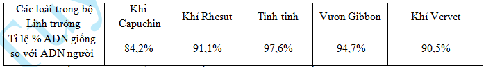 Để xác định mối quan hệ họ hàng giữa người và các loài thuộc bộ Linh trưởng (bộ Khỉ), người ta nghiên cứu mức độ giống nhau về ADN của các loài này so với ADN của người. Kết quả thu được (tính theo tỉ lệ % giống nhau so với ADN của người) như sau: