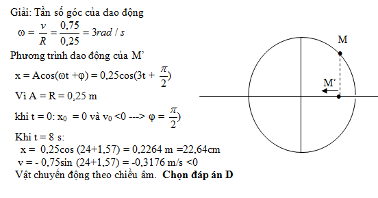 Một chất điểm M chuyển động với tốc độ 0,75 m/s trên đường tròn có đường kính bằng 0,5m. Hình chiếu M’ của điểm M lên đường kính của đường tròn dao động điều hoà. Tại t = 0s, M’ đi qua vị trí cân bằng theo chiều âm. Khi t = 8s hình chiếu M’ qua li độ: