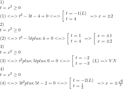 egin{array}{l} 1){x^4} - 3{x^2} - 4 = 0\ 2){x^4} - 5{x^2} + 4 = 0\ 3){x^4} + 5{x^2} + 6 = 0\ 4)3{x^4} + 5{x^2} - 2 = 0 end{array}